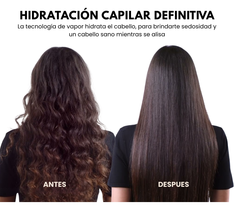El liso dura más. La tecnología de vapor inyecta humedad protectora y sella la cutícula. Esto impide que el cabello absorba la humedad ambiental (la causa principal del frizz), manteniendo el liso más tiempo y haciéndolo resistente al encrespamiento.
