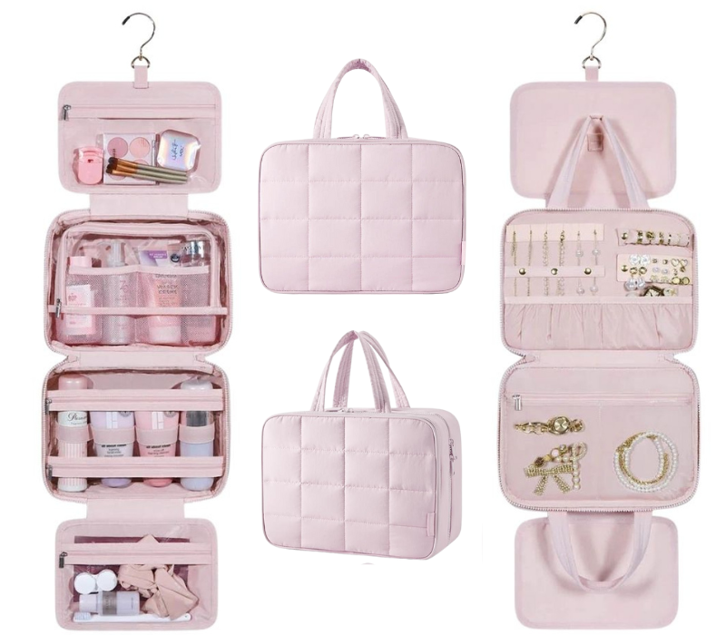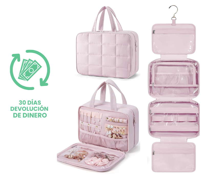 Sí. El gancho giratorio está diseñado para soportar el peso de un neceser completamente cargado con líquidos, cremas, maquillaje y accesorios, permitiéndote colgarlo de forma segura en toalleros o puertas.